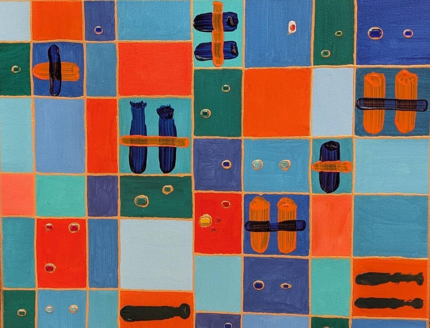 Neben meinen oben bereits erwähnten Werken gibt es auch einige Bilder, die der abstrakten Kunst zuzuschreiben sind, in leuchtenden Farben, kombiniert mit geometrischen Formen und teilweise veredelt mit feinem Blattgold.